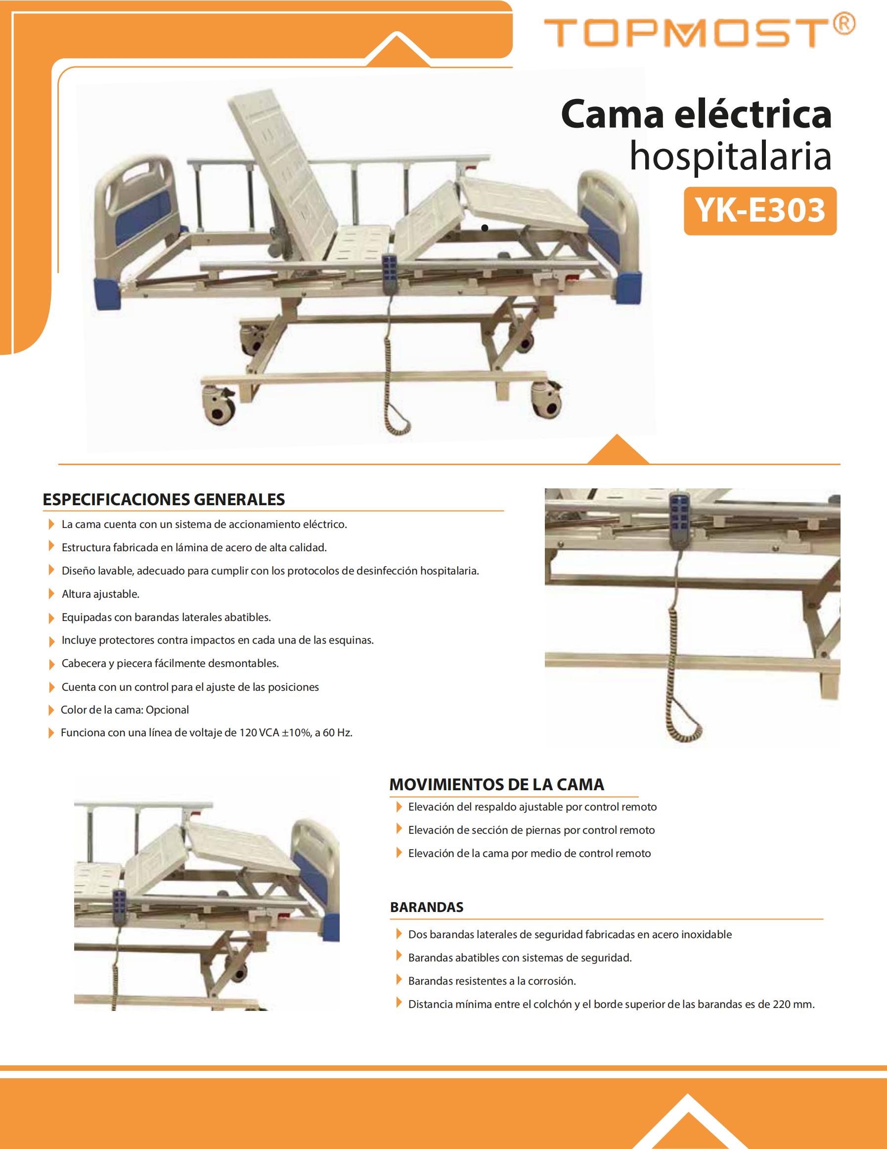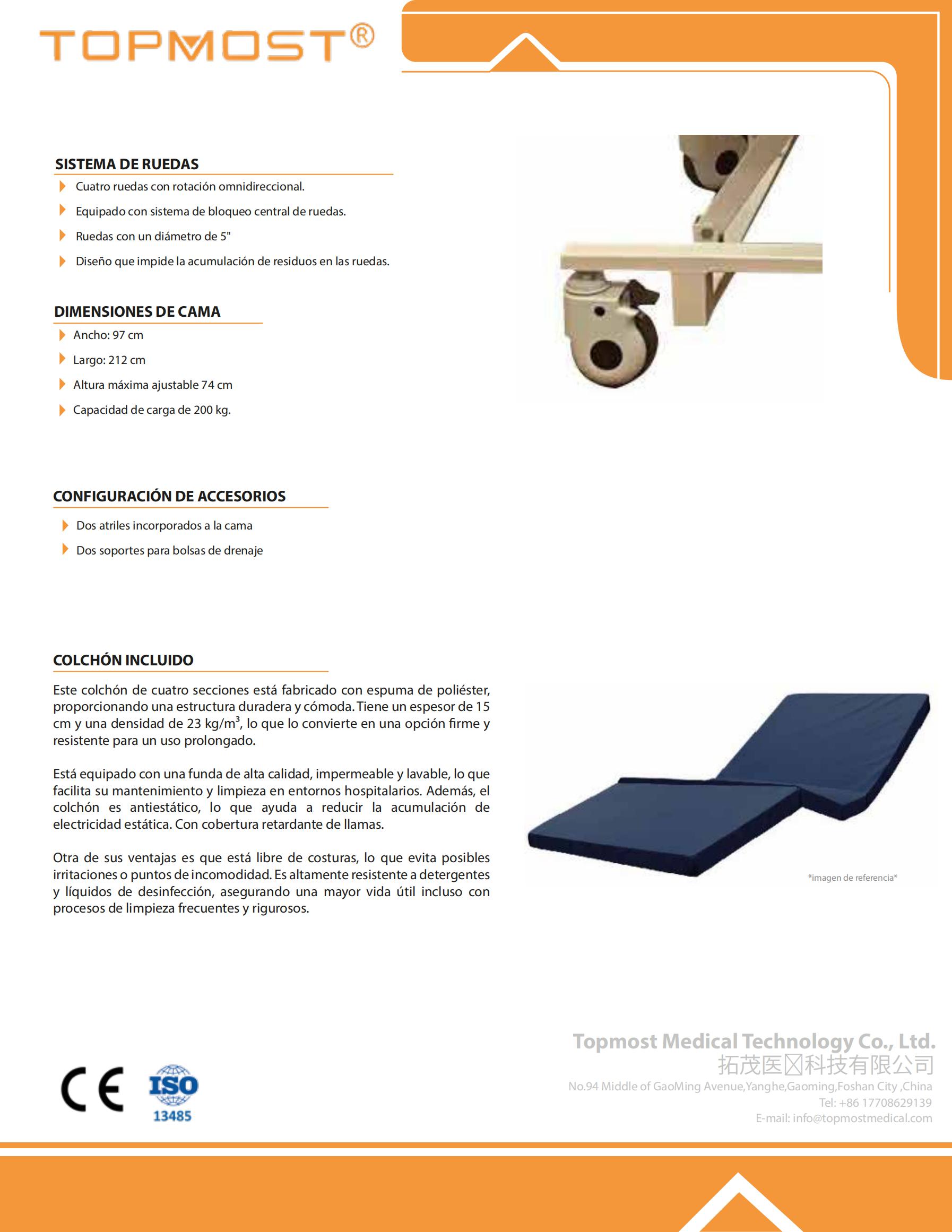 •Accesorios: 1 soporte para suero de acero inoxidable con altura ajustable, 4 ganchos para bolsas de orina y 4 orificios para suero.