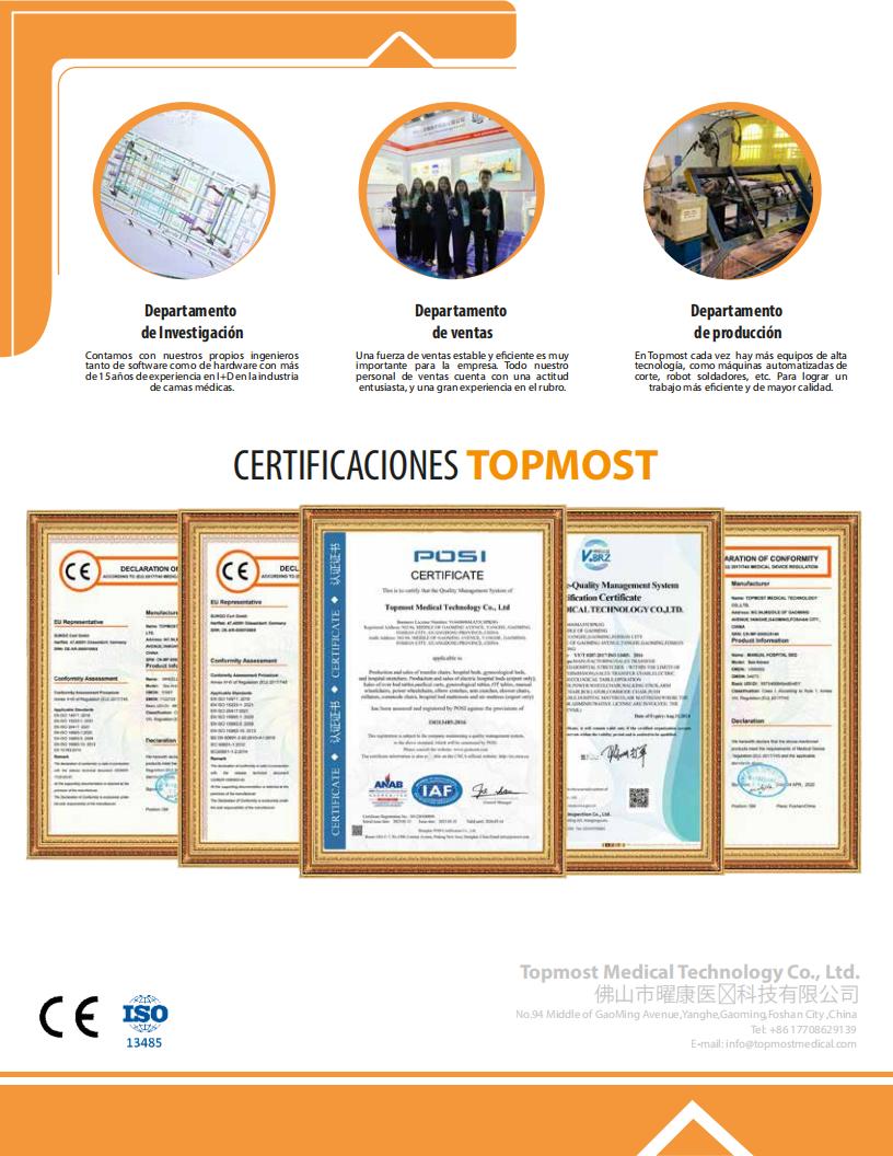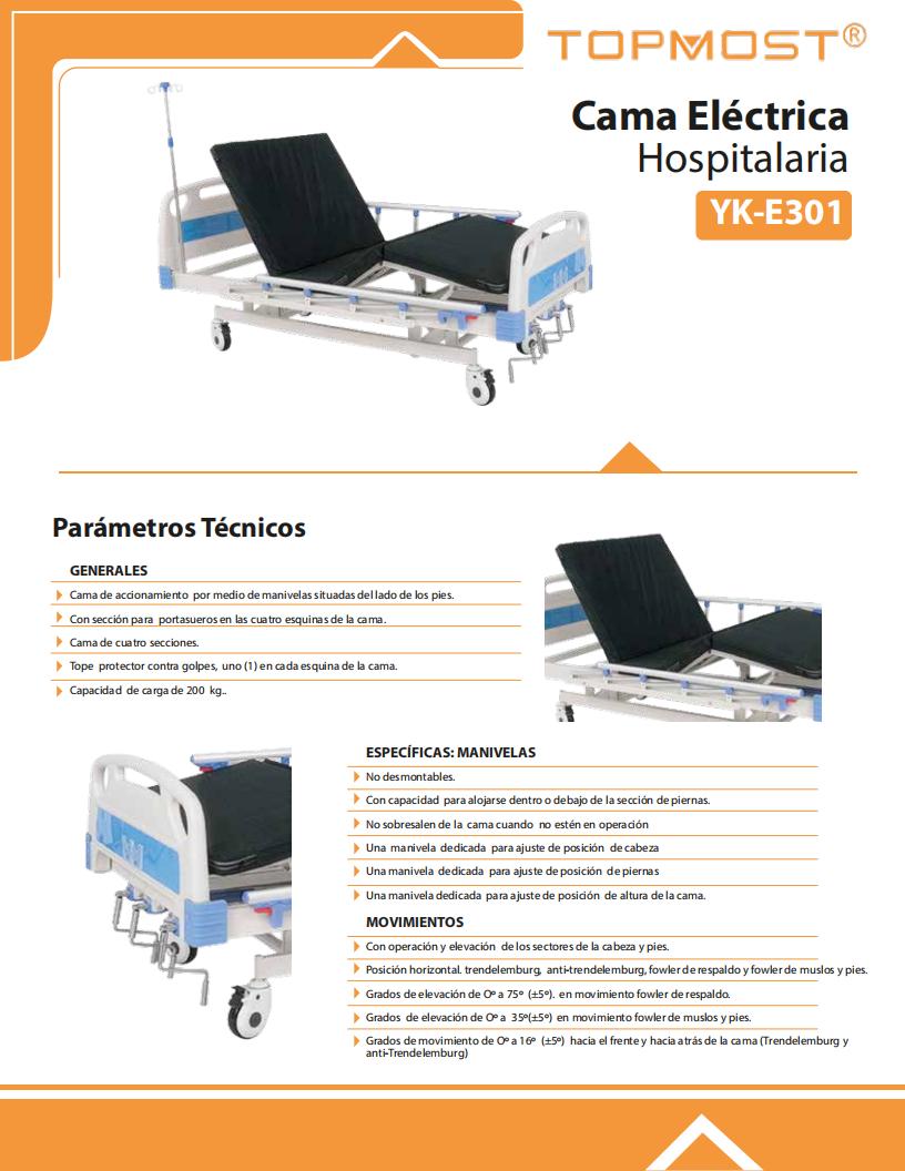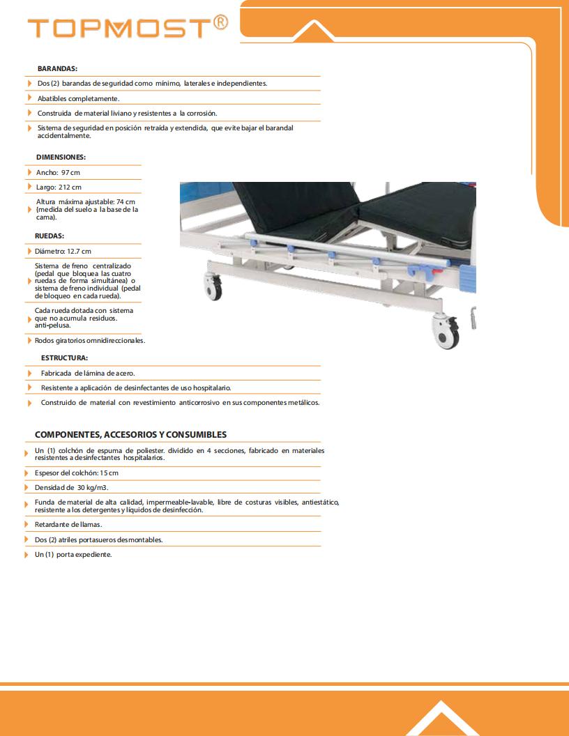 - Accesorios: 1 soporte para suero de acero inoxidable con altura ajustable; 4 ganchos para bolsas de orina; 4 orificios para suero