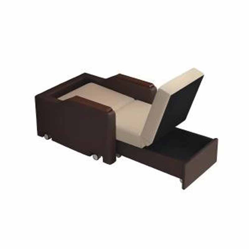 La silla presenta un diseño exterior tipo sofá. La tapicería es de cuero sintético calandrado de PU ecológico, con reposabrazos de madera maciza y una estructura de acero parcial. Incluye un compartimento de almacenamiento integrado y ruedas silenciosas ocultas. El interior de la silla está equipado con componentes telescópicos que permiten una extensión y retracción suave y sin esfuerzo.