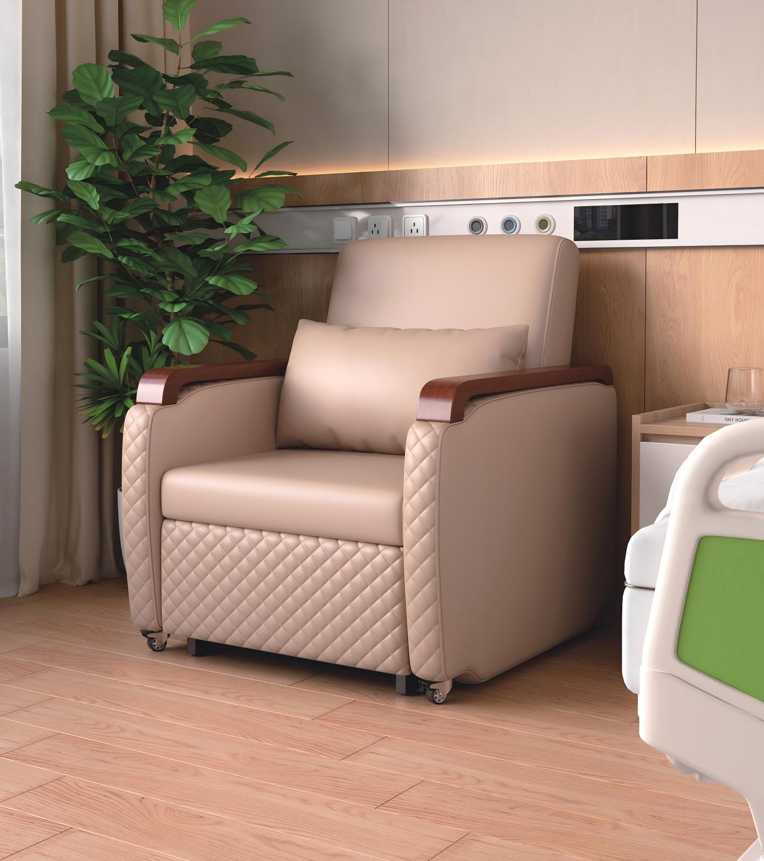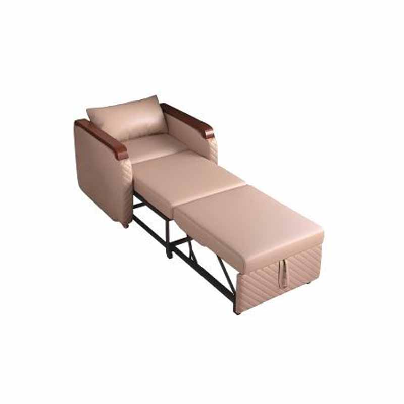 La silla presenta un diseño exterior tipo sofá. La tapicería es de cuero sintético calandrado de PU ecológico, con reposabrazos de madera maciza y una estructura de acero parcial. Está equipada con ruedas silenciosas ocultas. El interior de la silla incluye componentes telescópicos que permiten una extensión y retracción suave y sin esfuerzo.