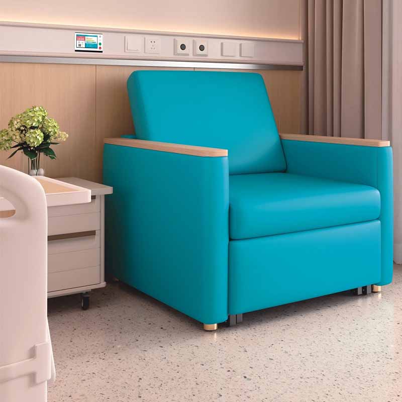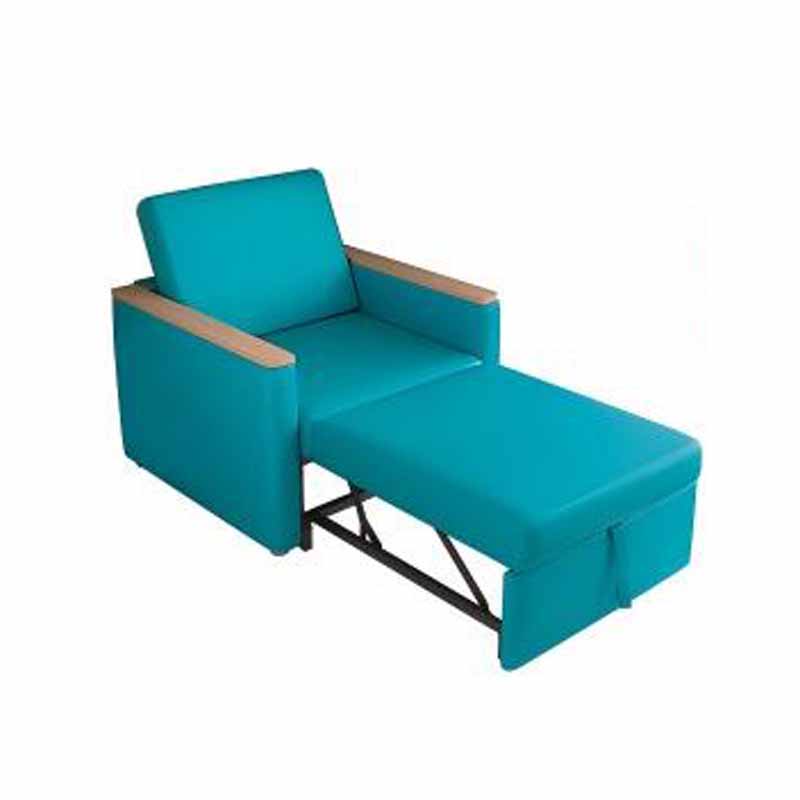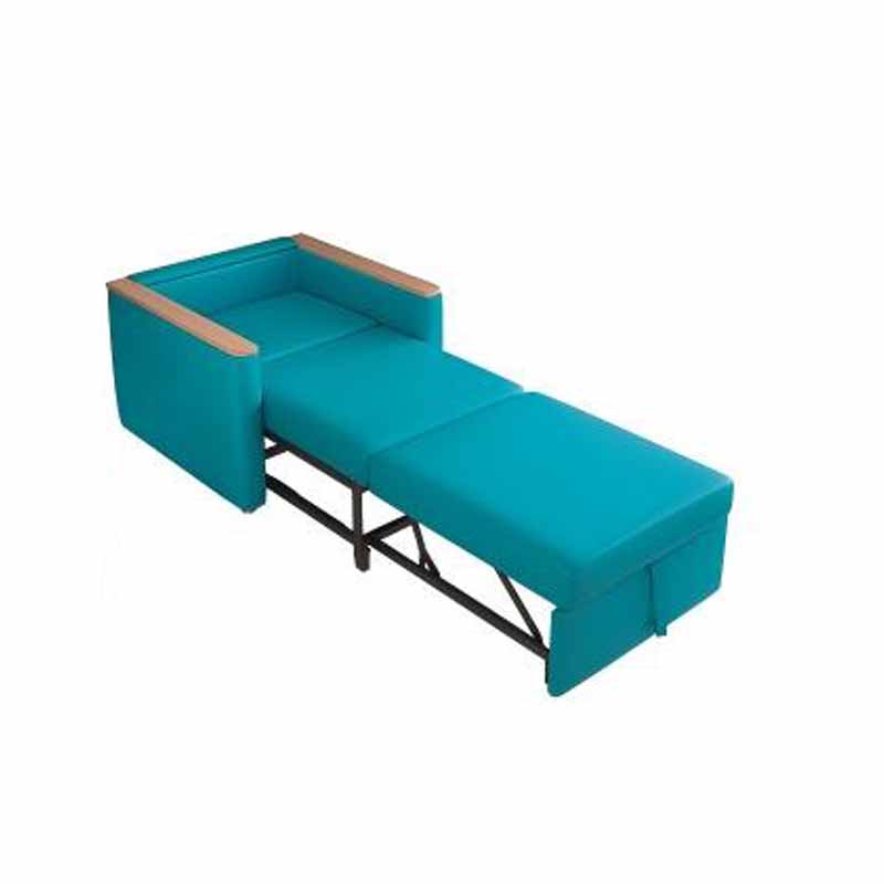 Diseño tipo sofá con tapizado de piel sintética con revestimiento de PU ecológico, reposabrazos de madera maciza y estructura parcialmente de acero. Cuenta con ruedas silenciosas ocultas y un mecanismo telescópico interno para extenderlo y retraerlo fácilmente.
